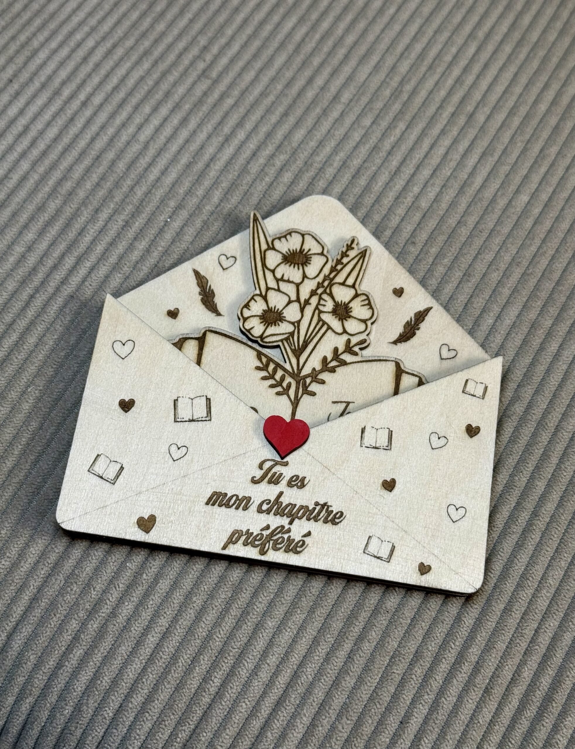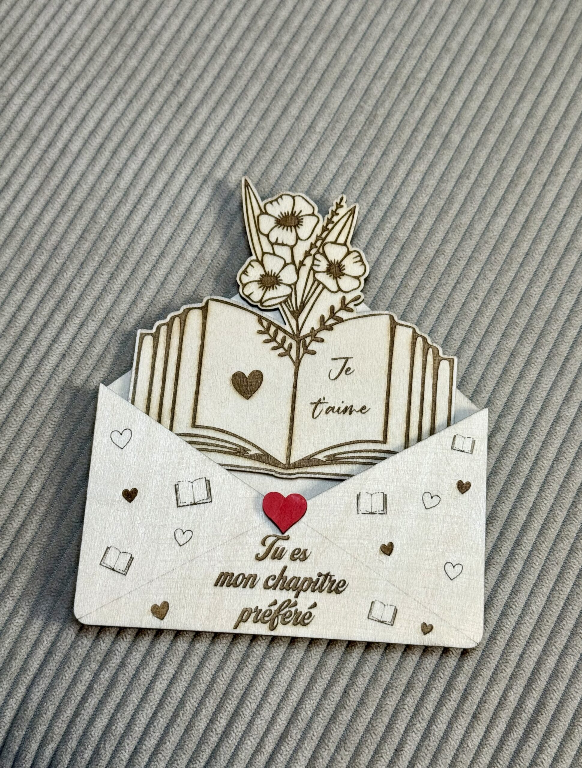 Cette enveloppe en bois, gravée avec soin, est un cadeau unique pour les amoureux des livres.