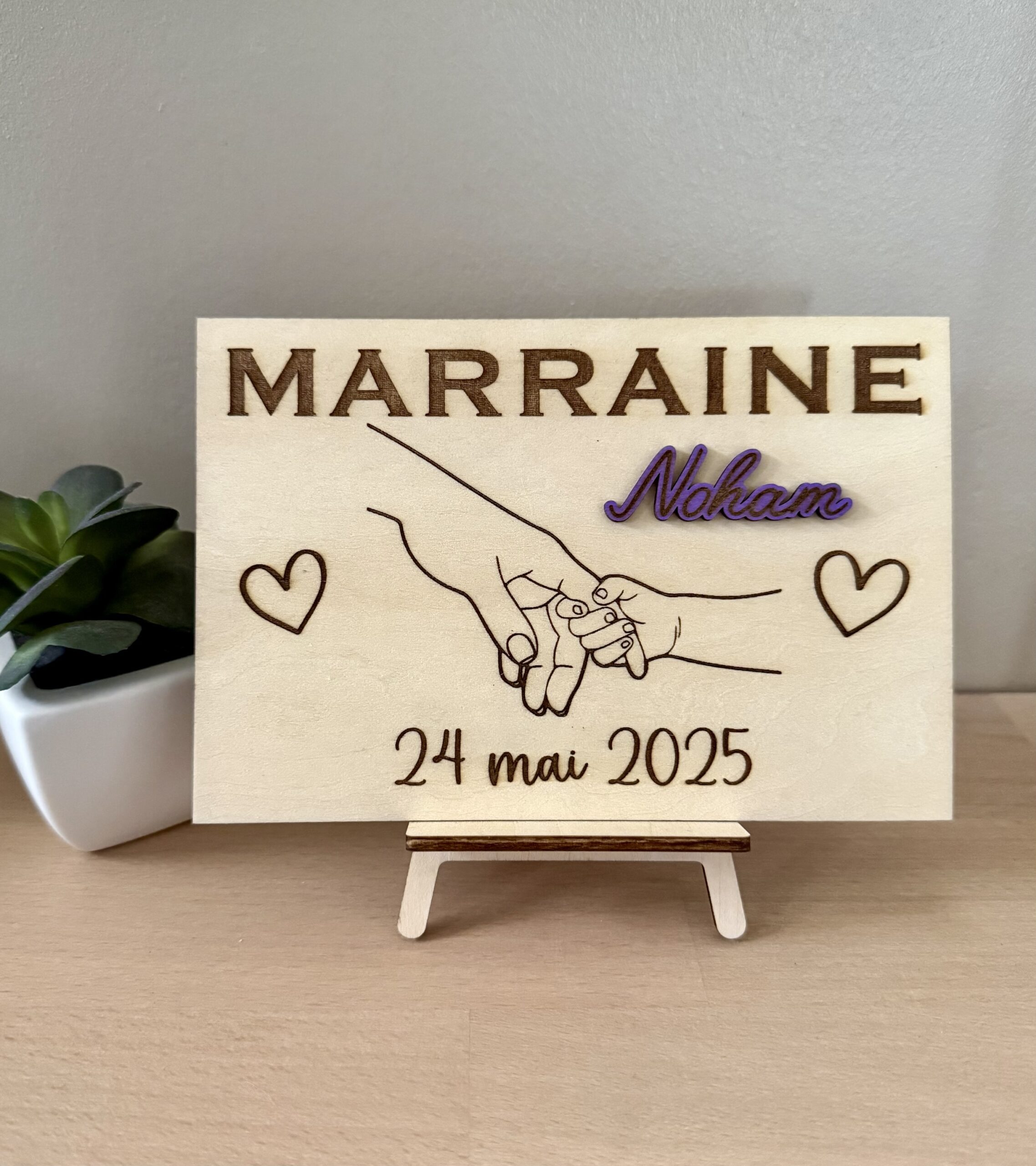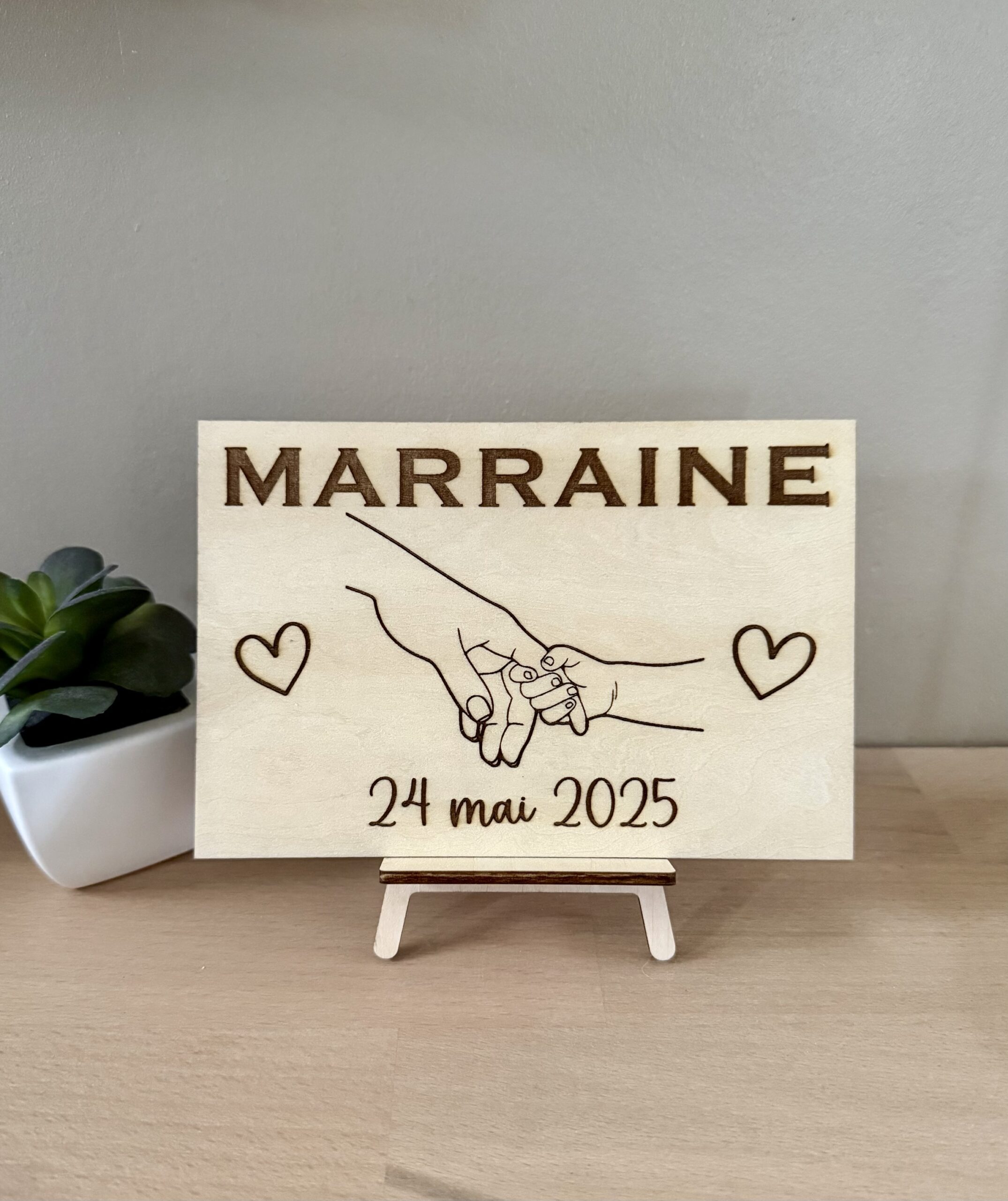 Cette plaque en bois gravée est idéale pour annoncer ou remercier le parrain et la marraine de votre enfant.