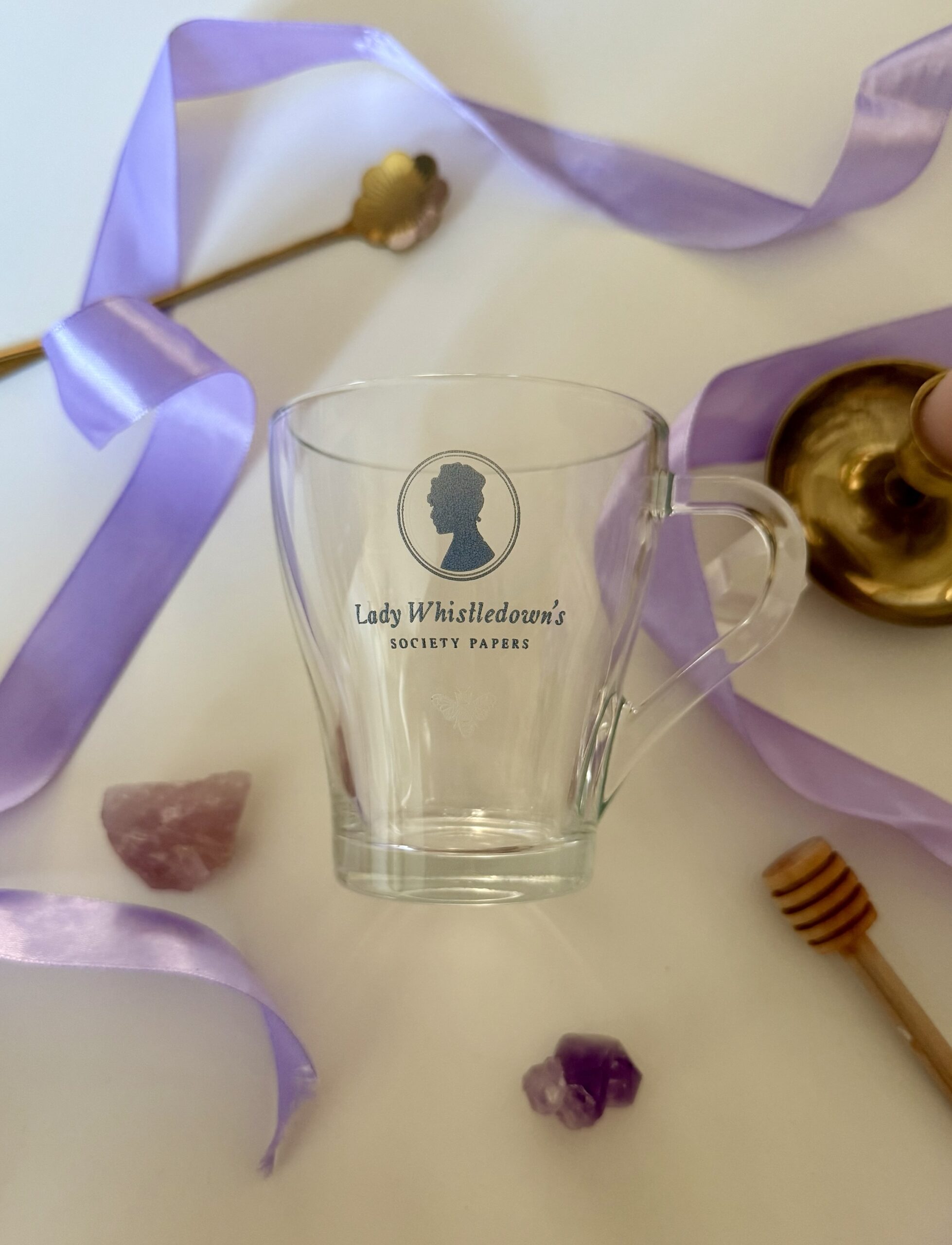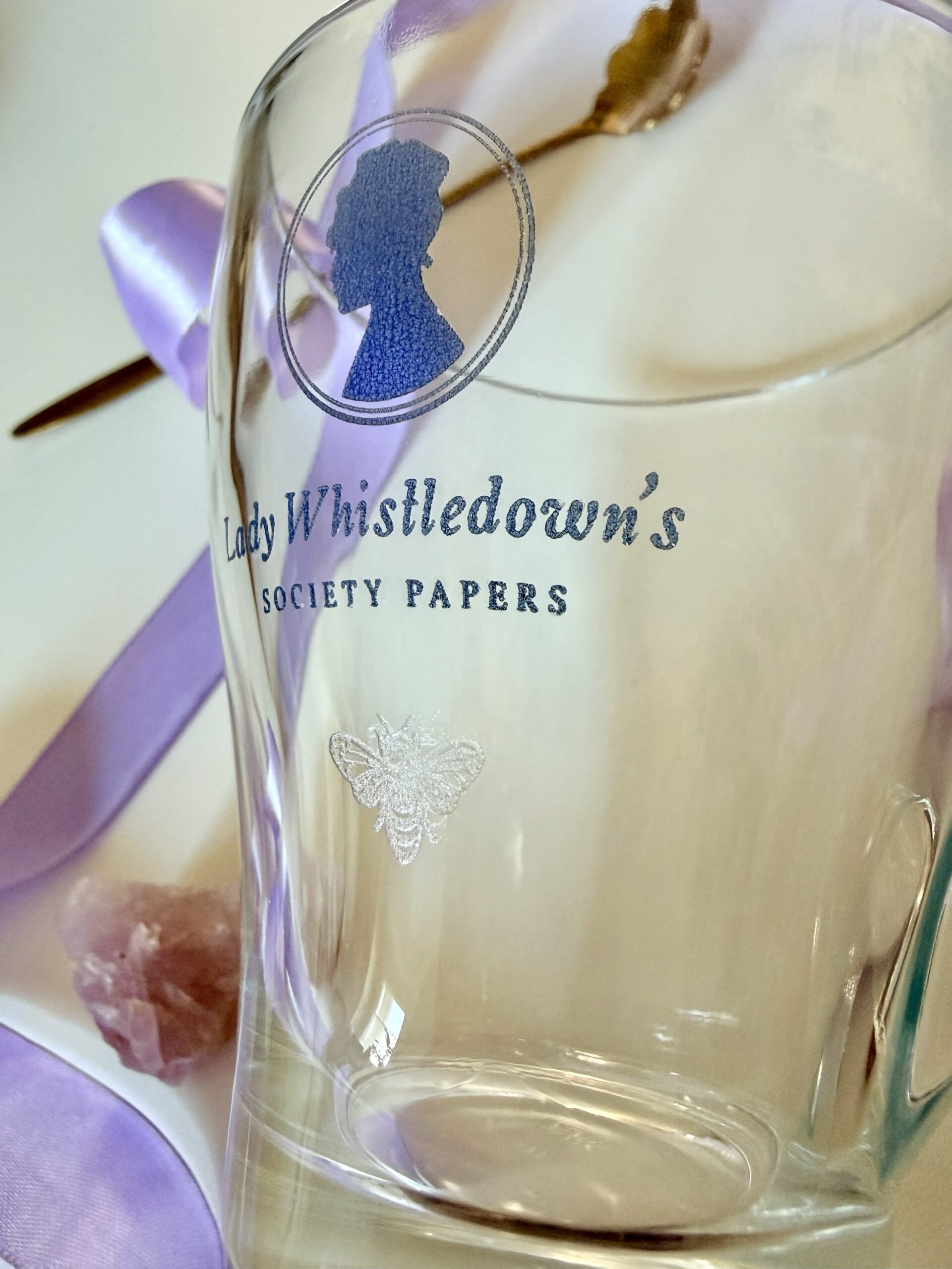 Découvrons cette délicate tasse à thé « Bridgerton » en verre, un véritable bijou.